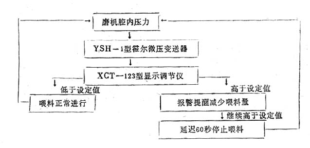 立磨機的飽磨主要是由以下幾方面的原因造成的:①喂料量太大;②排風量太少;③選粉機故障。一旦磨機發(fā)生飽磨現(xiàn)象,電機將處于過載運行狀態(tài),所以必須設(shè)置保護裝置,以免燒壞電機。某些國產(chǎn)立磨機沒有飽磨保護裝置。對此問題同力重機建議可以采取了下面的保護措施:在磨腔側(cè)開一測壓孔,測量磨內(nèi)的負壓,根據(jù)磨腔內(nèi)負壓與物料多少成一定比例關(guān)系的原理,將此負壓通過一個YSH—1型霍爾微壓變送器轉(zhuǎn)換成毫伏信號,再將此信號輸入到一個XCT—123型的顯示調(diào)節(jié)儀中,當磨內(nèi)負壓達到上限設(shè)定值(此值由實際測取,磨機型號不同此值不同)時,顯示調(diào)節(jié)儀中的繼電器接點動作,發(fā)出報警信號,提醒操作工減少喂料量。如果負壓繼續(xù)超過設(shè)定值延時60秒后,控制喂料器停止喂料,待磨內(nèi)負壓低于設(shè)定值時,喂料器又重新開始正常喂料。其原理如圖1所示。