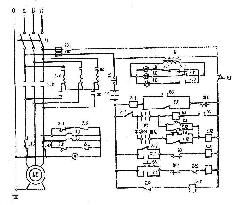 將組合開關(guān)置于自動方式位置,按下QA,QC吸合并自鎖,SJ得電,同時ZJ1得電自鎖,待到整定時間后SJ1的常開延時接點閉合,ZJ2得電動作,此時XLC得電動作,整個起動過程完成。ZJ1、ZJ2、SJ均斷電,只有XLC、SJ1通電。這樣既防止了電動機直接起動的可能,同時又延長了中間繼電器的壽命,并且ZJ1、ZJ2、SJ在全壓運行時,不再消耗能量。尤其是在起動中,如果由于種種原因ZJ2不動作,那么SJ1得電,SJ1串于電流互感器保護回路中的常閉延時接點在延遲一定時間(此時間大于SJ的整定時間)后斷開,熱繼電器RJ起過流保護作用。這樣與進線空氣開關(guān)形成對過電流起動的雙重保護。