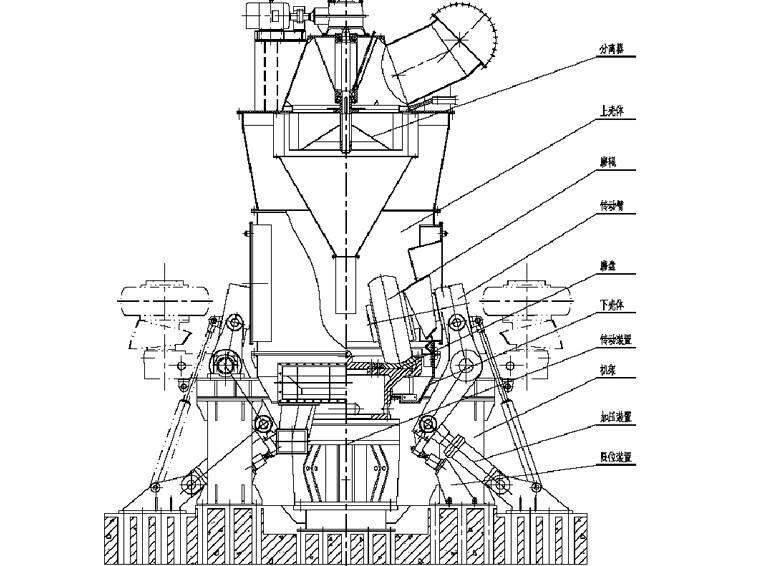 立磨機(jī)的主要結(jié)構(gòu)由分離器、磨輥裝置、磨盤裝置、加壓裝置、減速機(jī)、電動機(jī)、殼體等部分組成。分離器是決定磨粉產(chǎn)品粗細(xì)的重要部件,它由可調(diào)速的傳動裝置、轉(zhuǎn)子、導(dǎo)向風(fēng)葉、殼體、粗粉落料錐斗、出風(fēng)口等組成,是一種高效、節(jié)能、快捷的選粉裝置。磨輥是對物料進(jìn)行碾壓粉磨的主要部件、它被裝在磨機(jī)的彎臂上,在外力的作用下,緊壓在磨盤的物料上,在磨盤的帶動下,磨輥隨之轉(zhuǎn)到,從而使物料被碾壓而粉碎。磨盤固定在減速機(jī)的輸出軸上,磨盤上部為料床,料床上有環(huán)形槽,物料就是在環(huán)形槽內(nèi)被磨輥碾碎的。加壓裝置時提供磨輥碾磨壓力的部件,它由高壓油站、液壓缸拉桿、蓄能器等組成,能向磨輥施加足夠的壓力使物料粉碎。減速機(jī)是傳遞動力的主要部件,磨盤的轉(zhuǎn)速就是減速機(jī)輸出抽的轉(zhuǎn)速。