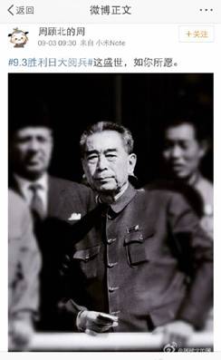 讓人難忘的細(xì)節(jié)不僅僅在閱兵場(chǎng)上。3日上午9時(shí)30分,習(xí)近平主席偕夫人彭麗媛正在天安門迎候各國(guó)嘉賓,閱兵尚未正式開(kāi)始,會(huì)場(chǎng)內(nèi)外興奮期待的氛圍漸濃。就在此時(shí),網(wǎng)友“周顧北的周”發(fā)布了一條微博“這盛世,如你所愿”,配圖是一張周恩來(lái)總理的老照片。短短的七字微博引發(fā)了網(wǎng)友的強(qiáng)烈共鳴,轉(zhuǎn)發(fā)已過(guò)百萬(wàn)。“開(kāi)國(guó)大典的時(shí)候飛機(jī)不夠,周總理說(shuō)飛兩遍,現(xiàn)在再也不需要飛兩遍了,要多少有多少。山河猶在,國(guó)泰民安。當(dāng)年送你的十里長(zhǎng)安街,如今已是十里繁榮。”
