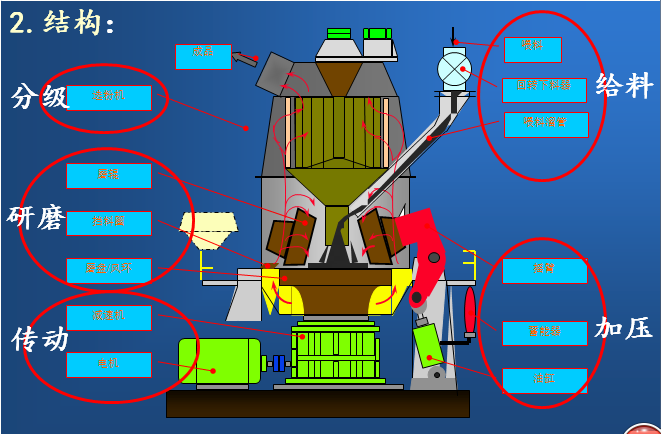 1、磨盤:包括導向環(huán)、風環(huán)、擋料圈、襯板、盤體、 刮料板和提升裝置等。