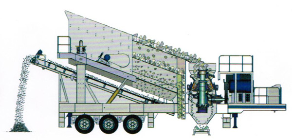 在移動圓錐式破碎站的工作過程中,電動機通過傳動裝置帶動偏心套旋轉,動錐在偏心軸套的迫動下做旋轉擺動,動錐靠近靜錐的區段即成為破碎腔,物料受到動錐和靜錐的多次擠壓和撞擊而破碎。動錐離開該區段時,該處已破碎至要求粒度的物料在自身重力作用下下落,從錐底排出。